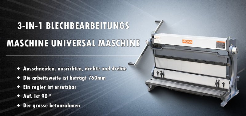 BOKA 3-IN-1 Blechbearbeitungsmaschine, 760 mm Universalmaschine für Schneiden, Biegen & Rollen, manuelle Schwenkbiegemaschine 90° Abkantbank